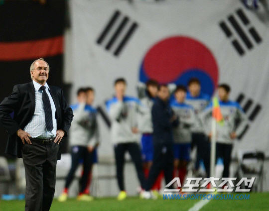 슈틸리케 감독이 이끄는 축구대표팀이 14일 코스타리카 대표팀과 평가전을 치렀다. 후반 막판 기성용이 골을 넣었지만 선심이 오프사이드를 선언했다. 슈틸리케 감독이 선심을 바라보며 아쉬워하고 있다. 서울월드컵경기장=정재근 기자 cjg@sportschosun.com/2014.10.14/