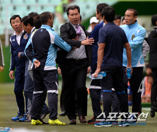 전북과 울산의 2014 K리그 클래식 31라운드 경기가 12일 전주월드컵경기장에서 열렸다. 1-0, 전북의 승리로 경기가 종료된 후 화가 난 울산 조민국 감독이 전북 벤치로 향하자 전북 최강희 감독과 코칭스탭이 이야기를 듣고 있다. 조민국 감독은 레오나르도가 후반 초반 한재웅의 충돌 상황에서 울산 벤치를 향해 욕설을 뱉었다고 지적했다. 전주=허상욱 기자 wook@sportschosun.com/2014.10.12/