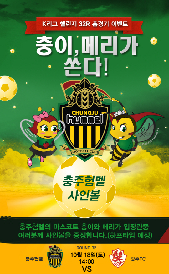 이날 홈 경기 하프타임에 충이와 메리는 경기장을 돌며 팬들에게 감사의 의미로 사인볼 150개를 직접 전달하는 퍼포먼스를 펼칠 예정이다.