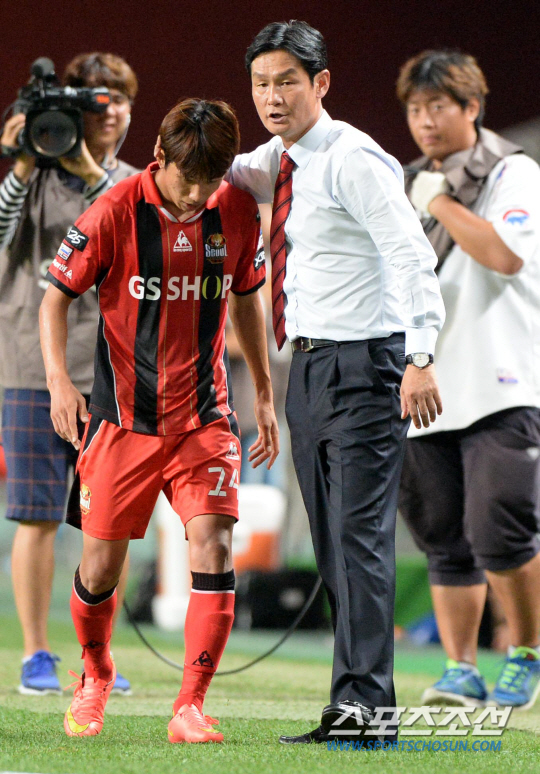 FC서울과 인천 유나이티드의 K리그 클래식 2014 21라운드 경기가 16일 서울월드컵경기장에서 열렸다. 서울 윤일록이 후반 교체되며 최용수 감독의 격려를 받고 있다. 상암=허상욱 기자 wook@sportschosun.com/2014.08.16/