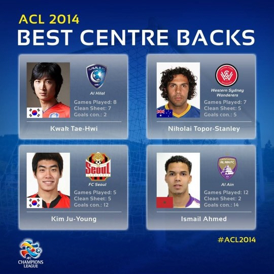 곽태휘 김주영과 함께 웨스턴시드니의 돌풍을 이끈 니콜라이 토폴-세탠리, 알 아인의 이스마일 아메드도 최고 센터백에 이름을 올렸다.