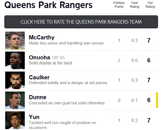 20일 스카이스포츠의 평점은 7점이었다. '태클은 좋았지만, 종종 포지션에 묶였다'라는 평가와 함께 7점을 부여했다. 공격라인에서 맹활약한 자모라에게 최고평점 8점을 부여했을 뿐, 2골을 터뜨린 바르가스를 비롯한 QPR 대부분의 선수들이 평점 6~7점을 받았다. 전영지 기자 sky4us@sportschosun.com