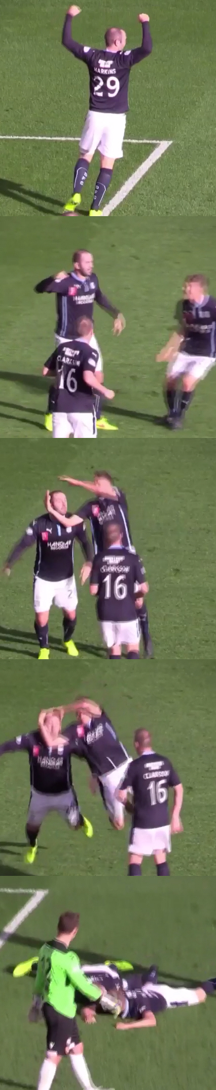 스코틀랜드 프리미어리그(SPL) 던디FC 선수들에게는 이런 세리머니가 다소 식상했던 모양이다. 영국 일간지 데일리메일은 20일(한국시각) '던디FC의 게리 헤킨스와 짐 매컬리스터가 선보인 미국프로레슬링(WWE) 기술 세리머니가 SNS에서 폭발적 인기를 끌고 있다'고 전했다.