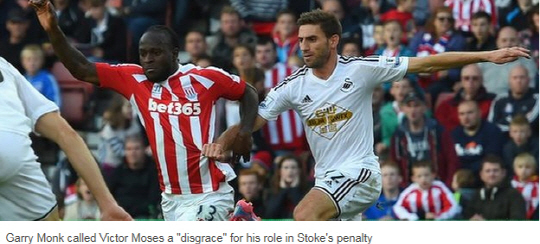 양팀 사령탑이 경기가 끝난 뒤 서로 오심 피해자라고 주장하는 진풍경이 벌어졌다. 스토크시티에 선제골을 넣고도 1대2로 역전패를 당한 스완지시티의 게리 몽크 감독은 경기를 마친 뒤 "빅터 모세스가 스스로 부끄러운줄 알아야 한다. 다이빙으로 심판을 속였다"며 모세스에게 직격탄을 날렸다. 스완지시티는 1-0으로 앞선 전반 32분 랑헬이 모세스에게 파울을 범해 페널티킥을 내줬다. 그러나 몽크 감독은 모세스가 페널티박스를 돌파하던 중 랑헬의 팔이 몸통에 닿자 고의로 넘어져 페널티킥을 얻어냈다고 주장하고 있다. 몽크 감독은 "정말 미세한 접촉이었다. 심판의 역겨운 판정이었다"며 날을 세웠다.