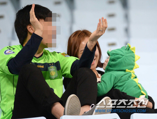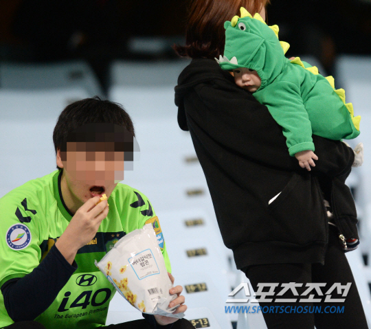 전북 현대와 성남 일화의 2014 FA컵 4강전이 22일 전주월드컵경기장에서 열렸다. 아기와 함께 경기장을 찾은 가족이 경기를 지켜보고 있다. 아기공룡 옷을 입은 아기가 아빠의 과자를 뚫어져라 보는 모습이 재미있다.