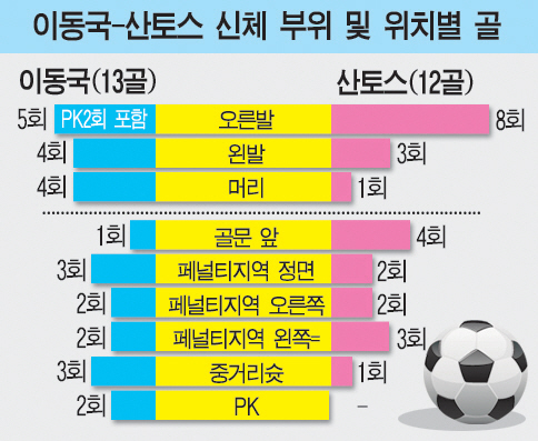 득점왕 유력 후보는 이동국과 산토스다. 둘은 포지션은 물론이고 스타일도 완전 다르다. 이동국은 전형적인 최전방 스트라이커다. 온 몸이 무기다. 13골 가운데 오른발로 5골, 왼발로 4골을 넣었다. 머리로도 4골을 넣었다. 골을 넣은 지역도 다양하다. 페널티지역 내에서 넣은 골은 페널티킥골 포함 9골이다. 페널티지역 내에서는 위치를 가리지 않는다. 정면에서 3골, 오른쪽과 왼쪽에서 각각 2골을 넣었다. 중거리슛골도 3골이나 있다. 특정 부위나 위치에 편중되지 않기 때문에 수비수나 골키퍼 입장에서는 부담스럽다. 특히 이동국의 전매특허는 발리슈팅이다. 수비수들이 자세를 취하기도 전에 터져나오는 발리슈팅으로 3골이나 넣었다. 이동국의 또 다른 강점은 동료들이다. 나란히 8개의 도움을 기록하고 있는 이승기와 레오나르도가 이동국의 골을 돕기 위해 항상 대기 중이다.