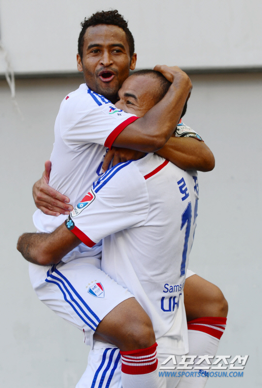 2014 프로축구 K리그 클래식 30라운드 FC서울과 수원삼성의 경기가 5일 서울월드컵경기장에서 열렸다. 수원의 로저가 팀의 첫번째 골을 성공시키고 산토스와 환호하고 있다. 상암=최문영 기자 deer@sportschosun.com