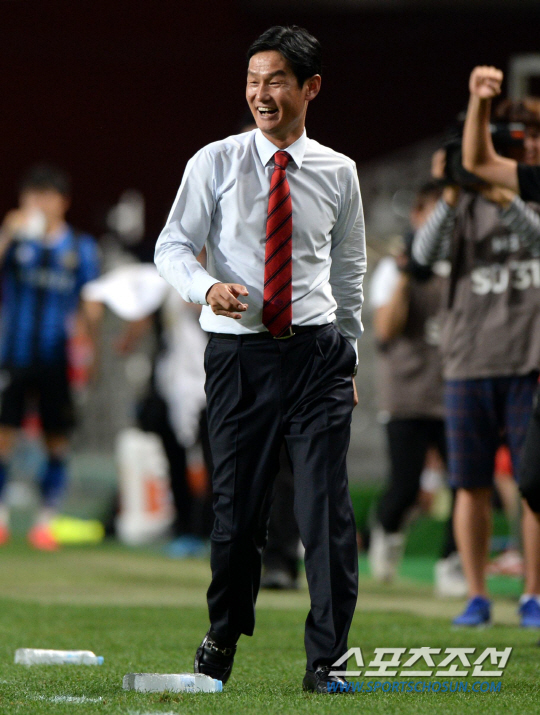 FC서울과 인천 유나이티드의 K리그 클래식 2014 21라운드 경기가 16일 서울월드컵경기장에서 열렸다. 후반 서울 몰리나가 팀의 네번째골을 터뜨렸다. 몰리나를 향해 환한 미소를 보이는 최용수 감독. 상암=허상욱 기자 wook@sportschosun.com/2014.08.16/