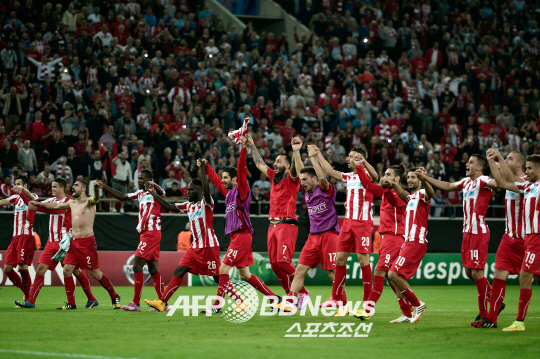◇유벤투스를 꺾은 올림피아코스 선수들이 환호하고 있다. 아테네(그리스)=ⓒAFPBBNews = News1