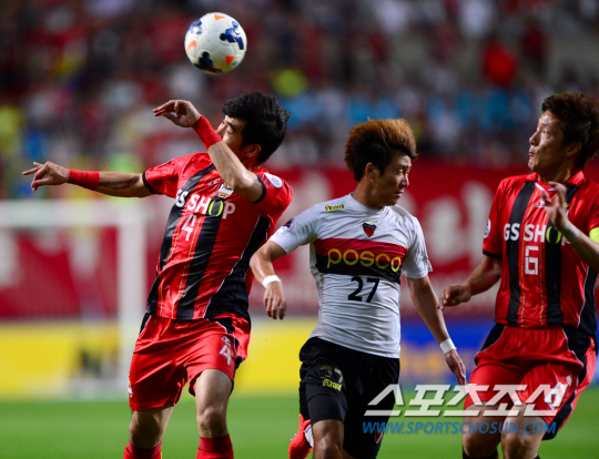 27일 서울 상암동 서울월드컵경기장에서 FC서울과 포항스틸러스의 2014 아시아축구연맹(AFC) 챔피언스리그 8강 2차전 경기가 열렸다. 지난 포항에서 열린 1차전에서는 양 팀이 득점 없이 무승부를 기록했다. 서울 김주영이 포항 박선주에 앞서 공중볼을 따내고 있다. 상암=송정헌 기자 songs@sportschosun.com/2014.08.27