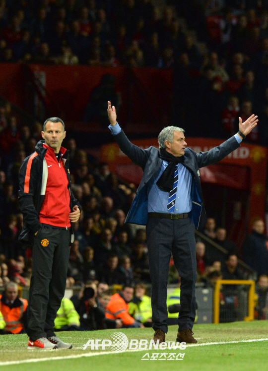 '맨유 더블 헤드록' 순간 무리뉴가 심판을 향해 격하게 항의하고 있다. ⓒAFPBBNews = News1