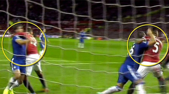 이날 양 팀이 0-0으로 맞선 전반 종료 직전, 첼시는 코너킥 찬스를 잡았다. 이때 페널티 지역 안쪽에서 헤딩을 노리던 테리에게 마르코스 로호가, 이바노비치에게는 크리스 스몰링이 바짝 밀착했다. 코너킥이 문전으로 날아드는 순간 네 선수는 뒤엉켜 넘어졌다.