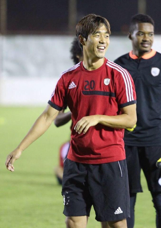 | ◇박주영이 알힐랄과의 2014~2015시즌 사우디 프로리그 7라운드를 앞두고 알샤밥 팀 훈련 도중 동료들을 바라보며 미소를 짓고 있다. 사진캡쳐=알샤밥 페이스북 |