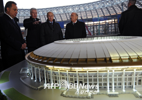 ◇2018년 러시아월드컵 준비 상황을 점검하기 위해 러시아를 찾은 블래터 회장이 푸틴 대통령과 함께 경기장 건설 현황을 보고 받고 있다. 모스크바(러시아)=ⓒAFPBBNews = News1