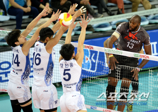 대한항공과 OK 저축은행의 2014-2015 프로배구 경기가 28일 인천계양체육관에서 열렸다. OK 저축은행 시몬이 대한항공 정지석, 전진용, 강민웅의 블로킹을 앞에 두고 공격을 시도하고 있다. 인천=허상욱 기자 wook@sportschosun.com