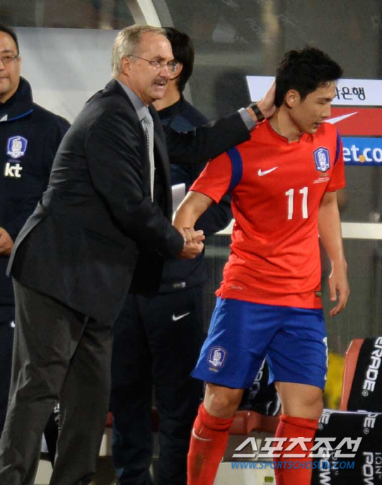 축구국가대표팀 울리 슈틸리케 감독이 데뷔전을 치렀다. 10일 천안종합운동장에서 슈틸리케 감독이 이끄는 한국 축구대표팀이 파라과이와 평가전을 펼쳤다. 슈틸리케 감독이 교체되어 들어온 남태희를 칭찬하고 있다. 천안=정재근 기자 cjg@sportschosun.com