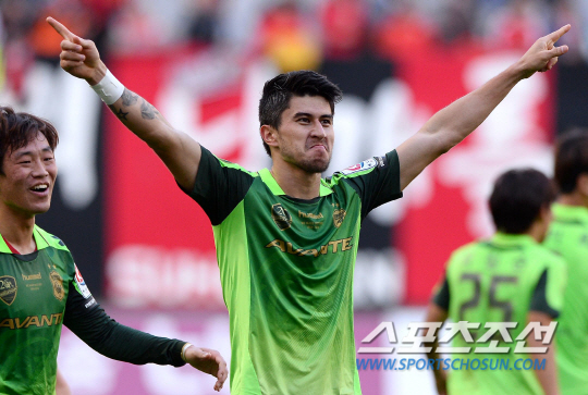 FC서울과 전북 현대가 2일 오후 서울월드컵경기장에서 K리그 클래식 34라운드 경기를 펼쳤다. 전북 카이오가 후반 추가 시간에 결승골을 성공시키며 FC서울에 1대0 승리했다. 득점에 성공하고 동료들과 함께 환호하는 카이오(가운데). 상암=송정헌 기자 songs@sportschosun.com/2014.11.2