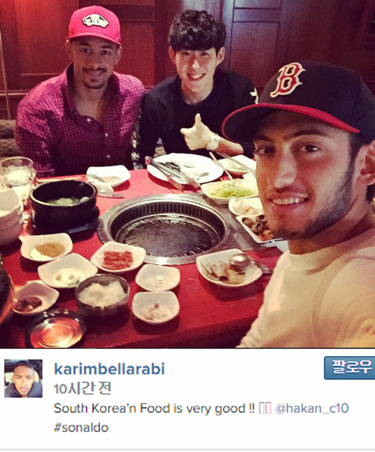 공개된 사진에서 칼하노글루와 벨라라비는 미소를 띤 채 카메라를 응시하고 있다. 손흥민은 환하게 웃으며 '따봉' 포즈를 취했다. 보기에도 친숙한 고깃집 식탁과 뚝배기, 쌀밥이 든 밥공기 등이 눈에 띈다.