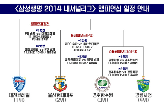 강릉시청과 경주한수원이 5일 강릉월드구장에서 4강 PO 1차전을 치른다. 4강 PO는 홈&어웨이 방식으로 1, 2차전을 치른다. 승점, 골득실, 원정다득점 순으로 승자를 결정한다. 그래도 동률일때는 2차전에서 연장전을 실시하고, 연장에서도 승부가 나지 않을 경우 승부차기를 진행한다.