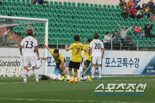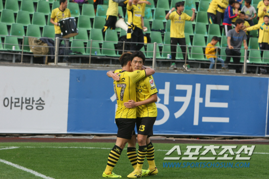 ◇'크로스의 달인' 대선배 현영민이 이종호의 10호골을 축하하기 위해 달려왔다. 선후배가 따뜻하게 끌어안으며 10호골의 기쁨을 나눴다. 사진제공=전남 드래곤즈 구단