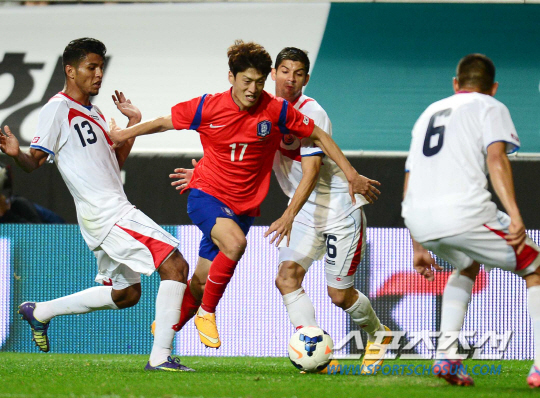 슈틸리케 감독이 이끄는 축구대표팀이 14일 코스타리카 대표팀과 평가전을 치렀다. 이청용이 수비수 두 명 사이를 돌파하고 있다. 서울월드컵경기장=정재근 기자 cjg@sportschosun.com/2014.10.14/
