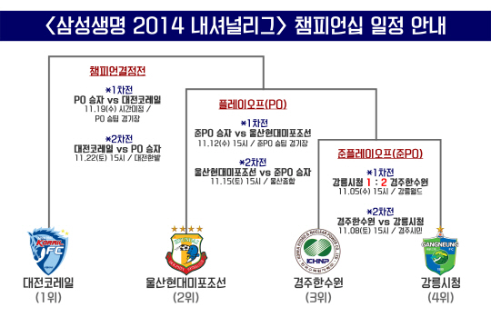 경주한수원과 강릉시청은 8일 오후 3시 경주시민운동장에서 2014년 삼성생명 내셔널리그 4강 PO 2차전을 펼친다. 경주한수원이 PO행의 유리한 고지를 선점했다. 경주한수원은 5일 강릉 원정에서 2대1 승리를 거뒀다. 내셔널리그 챔피언십은 승점, 골득실, 원정다득점 순으로 승자를 결정한다. 경주한수원은 2차전에서 0대1로 패해도 원정다득점에 의해 PO에 진출할 수 있다. 만약 2차전 90분이 강릉시청의 2대1 승리로 끝날 경우, 연장전이 진행된다. 연장전에서도 승부가 나지 않으면 승부차기가 펼쳐진다.