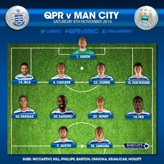 초반 맨시티는 사흘전 유럽챔피언스리그 조별 예선 CSKA모스크바전(1대2 패)의 피로감을 떨치지 못한 듯 지친 기색이 역력했다. 2무2패로 E조 최하위로 처진 맨시티의 손발이 맞아들지 않는 새 QPR이 초반 주도권을 잡았다. 애스턴빌라, 첼시전에서 2경기 연속골을 터뜨린 QPR 에이스 찰리 오스틴의 물오른 골 감각이 빛났다. 전반 초반부터 가벼운 몸놀림을 선보였다. 진기한 장면도 나왔다. 무려 삼세번만에 골을 인정받았다. 전반 6분 바르가스의 크로스에 이은 날선 헤딩이 골망을 흔들었지만 오프사이드 판정을 받았다. 곧이어 조 하트의 골킥을 곧바로 이어받아 또다시 골망을 흔들었으나 룰에 따라 이 역시 노골로 판정됐다. 집념의 오스틴은 포기하지 않았다. 삼세번만에 기어이 골에 성공했다. 전반 21분 박스 오른쪽에서 이슬라가 올린 크로스를 밀어넣으며 선제골을 터뜨렸다. 3경기 연속골, 최근 3경기에서 4골을 터뜨리는 골 감각을 과시했다.
