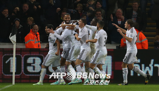 | 스완지시티 선수들이 시구르드손의 동점골이 터지자 모여서 축하를 해주고 있다. ⓒAFPBBNews = News1 |