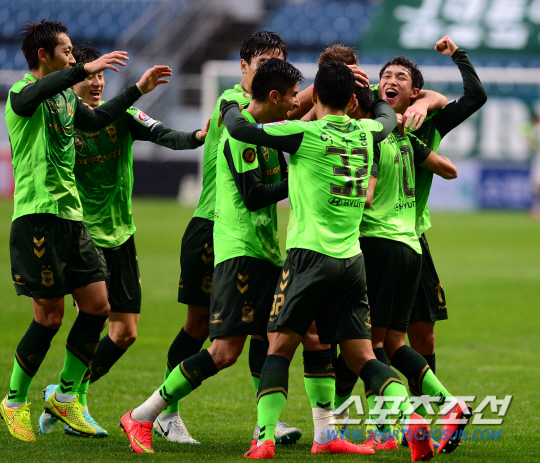 ◇전북 선수단이 8일 제주월드컵경기장에서 펼쳐진 제주와의 2014년 현대오일뱅크 K-리그 클래식 35라운드에서 전반 27분 레오나르도의 선제골이 터진 뒤 환호하고 있다. 서귀포=송정헌 기자 songs@sportschosun.com