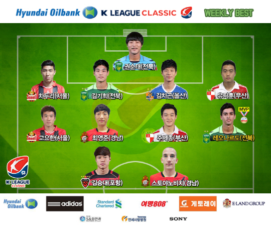 35라운드 최고의 공격수로는 3경기 연속골을 성공시킨 스토야노비치(경남)과 포항의 김승대가 선정됐다. 베스트 미드필더는 레오나르도를 비롯해 '슈퍼매치 결승골의 주인공' 고요한(서울)과 주세종(부산) 최영준(경남)이 차지했다. 유지훈(부산) 김치곤(울산) 김기희(전북) 차두리(서울)는 최고의 수비수에 이름을 올렸다. 골키퍼는 '전북의 수문장' 권순태의 몫이었다. 35라운드 최고의 팀에는 우승팀 전북이, 위클리매치에는 수원-서울전(1대0 서울 승)이 선정됐다.