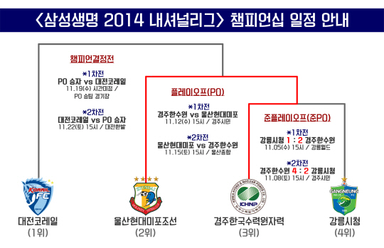 울산현대미포조선과 경주한수원이 15일 오후 3시 울산종합운동장에서 2014년 삼성생명 내셔널리그 플레이오프(PO) 2차전을 펼친다. 경주한수원의 홈에서 열린 1차전은 1대1 무승부로 끝이 났다. 결과에 대한 온도차는 있다. 이번 PO는 홈&어웨이 방식으로 1, 2차전을 치른다. 승점, 골득실, 원정다득점 순으로 승자를 결정한다. 원정에서 득점에 성공한 울산현대미포조선은 2차전에서 0대0으로 비기기만 해도 챔피언결정전에 오른다. 만약 2차전이 1대1 무승부로 끝날 경우에는 연장전을 실시하고, 연장에서도 승부가 나지 않을 경우 승부차기를 진행한다.