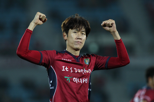 지난 8일 대전 한밭종합운동장에서 열린 수원FC와의 2014년 현대오일뱅크 K-리그 챌린지 35라운드. 김은중이 멀티골을 터뜨렸다. 우승 대관식을 앞두고 치러진 승부에서 단연 돋보였다. 시즌 마지막 홈 경기서 조진호 대전 감독은 전후반 90분을 김은중에게 헌사했다. 한 시즌 간 헌신한 레전드에 대한 예우였다. 후반 12분 페널티킥으로 선제골을 터뜨린 김은중은 후반 43분 오른발슛으로 다시 골망을 가르면서 대전의 5대2 쾌승을 완성했다. 김은중이 멀티골을 터뜨린 것은 강원 시절이던 지난 2012년 4월 7일 이후 2년 7개월여 만이었다. 백의종군을 자처한 뒤 한 시즌 내내 팀의 맏형으로 강등 1시즌 만의 복귀를 이끈 김은중에겐 최고의 피날레였다. 이날도 기립박수는 김은중의 몫이었다. 한국프로축구연맹은 12일 발표한 챌린지 35라운드 최우수선수로 김은중을 꼽았다. 프로연맹은 '이타적인 플레이로 패스에 중점을 두면서도 득점 기회를 놓치지 않으며 2득점을 했다'고 선정 배경을 밝혔다.