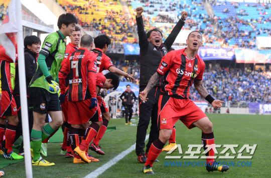 2014 프로축구 K리그 클래식 수원삼성과 FC서울의 경기가 9일 수원월드컵경기장에서 열렸다. 서울의 차두리와 동료선수들이 고요한의 결승골에 환호하고 있다. 수원=최문영 기자 deer@sportschosun.com /2014.11.09/