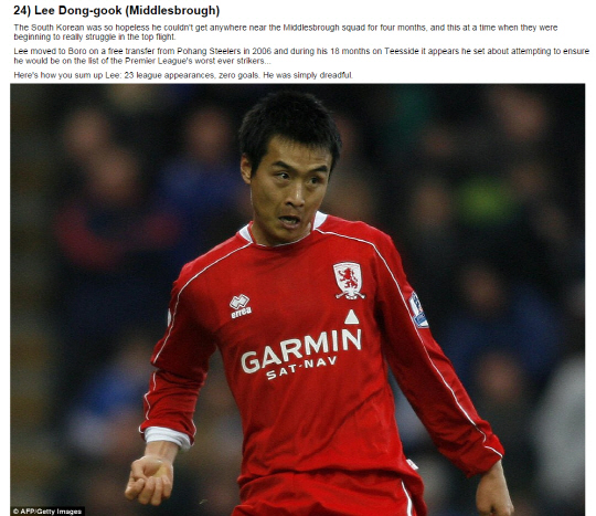 대표팀에서 나이를 잊은 활약을 펼치고 있는 이동국(35, 전북)이 영국 언론이 선정한 '프리미어리거 역대 최악의 스트라이커 50명' 중 24위에 오르는 불명예를 안았다.