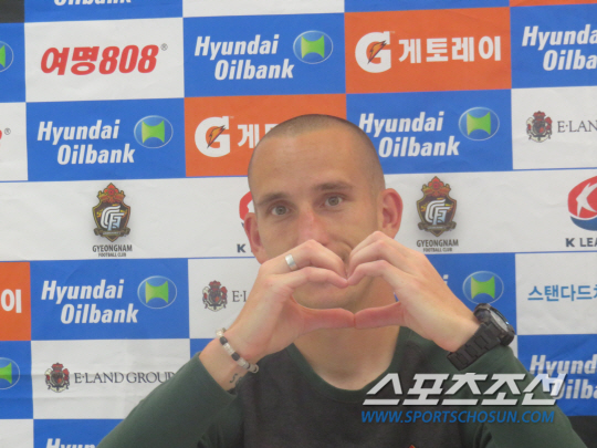 | ◇"딸 야나의 응원에 힘입어 골을 넣었다. 내일 딸의 생일을 맞아 꼭 골을 선물해주고 싶었다." 피말리는 강등권 전쟁속에 3경기 연속골을 쏘며 경남의 3경기 연속 무패를 이끈 스토야노비치가 경기 후 기자회견에서 딸 야나를 위한 하트를 만들어 보이고 있다. 창원=전영지 기자 |