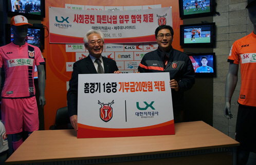 제주 유나이티드(SK 에너지 축구단)가 대한지적공사 제주특별자치도본부(제주특별자치도 본부장 안전규)와 손잡고 따뜻한 이웃사랑을 실천한다.