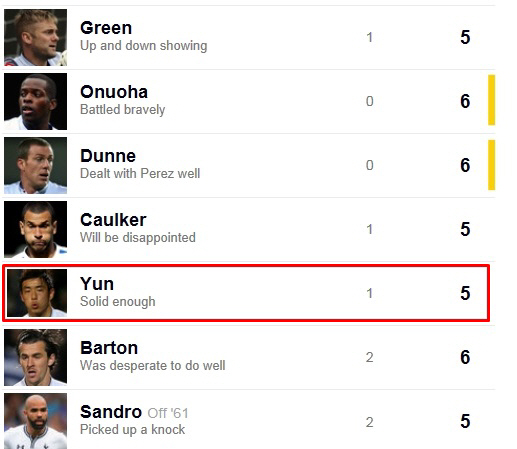 비록 패하긴 했지만 QPR 선수들에 대한 평가는 나쁘지 않았다. 경기 직후 영국 스포츠전문 매체 스카이스포츠 선수 평점에서 양팀 선수 대부분 5~6점을 받은 가운데 선제결승골을 기록한 시소코가 8점으로 최고점, 결승골을 도운 아메오비가 7점으로 두번째로 높은 평점을 받았다. 윤석영은 '충분히 견고했다(Solid enough)'는 평가와 함께 5점을 받았다. 후반 결정적인 골 찬스를 온몸으로 막아선 조이 바튼이 '잘하고자 하는 모습이 절박했다'는 평가와 함께 6점을 받았다. 마지막까지 집요하게 동점골을 노린 공격수 보비 자모라도 6점을 받았다.