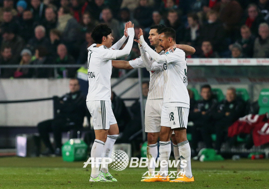 | 손흥민(왼쪽)이 골을 넣은 뒤 동료들의 축하를 받고 있다. ⓒAFPBBNews = News1 |
