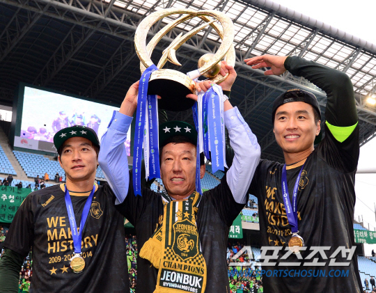 15일 전주 월드컵경기장에서 프로축구 전북과 포항의 경기가 열렸다. 이미 우승을 확정지은 전북현대가 포항에 1대0 승리하며 우승을 기념하는 승리까지 기록했다. 경기 종료 후 전북 선수들이 우승 세리머니를 펼쳤다. 전북 최강희 감독이 김남일, 이동국과 함께 포즈를 취하고 있다. 전주=송정헌 기자 songs@sportschosun.com/2014.11.15 |