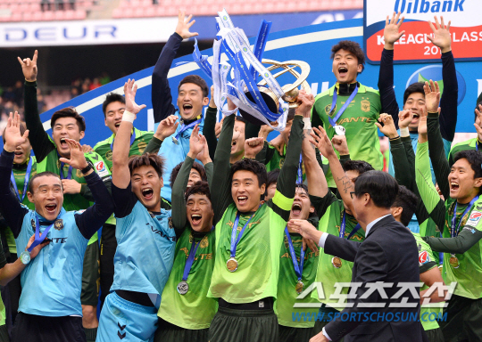 15일 전주 월드컵경기장에서 프로축구 전북과 포항의 경기가 열렸다. 이미 우승을 확정지은 전북현대가 포항에 1대0 승리하며 우승을 기념하는 승리까지 기록했다. 경기 종료 후 전북 선수들이 우승 세리머니를 펼쳤다. 이동국이 동료들과 함께 우승트로피를 들어보이고 있다. 전주=송정헌 기자 songs@sportschosun.com/2014.11.15 |