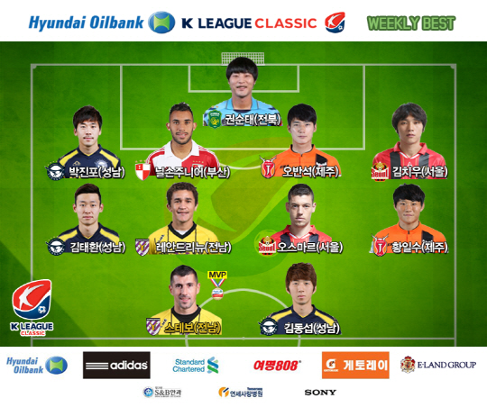 프로연맹은 37라운드 베스트 11도 공개됐다. 스테보는 김동섭(성남)과 함께 최고의 공격수로 뽑힌 가운데 베스트 미드필더에는 황일수(제주) 오스마르(서울) 레안드리뉴(전남) 김태환(성남)이 차지했다. 최고의 수비는 김치우(서울) 오반석(제주) 닐손주니어(부산) 박진포(성남), 수문장은 전북의 권순태에게 돌아갔다.