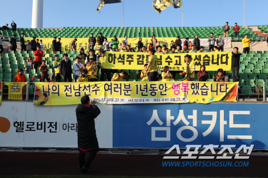 전남 서포터들은 하석주 감독과 선수들을 향한 따뜻한 플래카드를 들어올렸다. '하석주 감독님 수고하셨습니다' '나의 전남선수 여러분 1년동안 행복했습니다.' 전남 팬들은 올시즌 행복했다. 하석주가 지난 2년반 동안 바꿔놓은 광양의 작은 기적을 알아봤다.