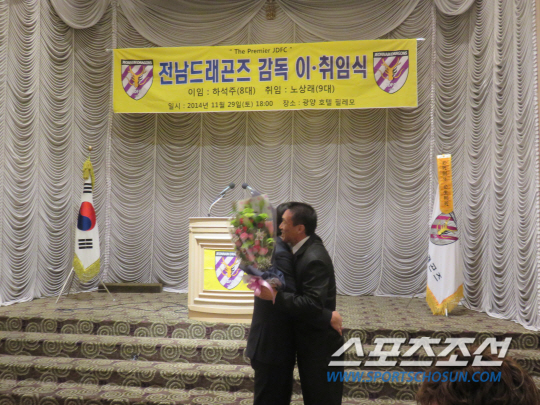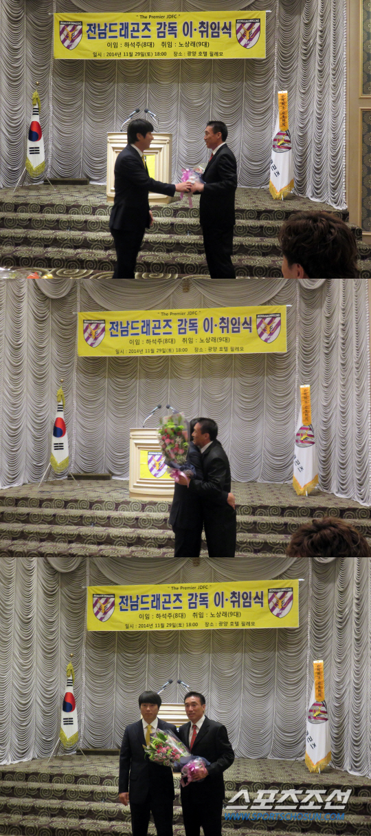 29일 오후 6시 전남 광양 필레모호텔 그랜드볼룸에서 전남드래곤즈 8-9대 감독 이취임식이 열렸다. 2012년 8월부터 2년반동안 전남 드래곤즈 사령탑으로 일해온 하 감독은 지난 11월 중순 사임의 뜻을 표했다. 최고의 파트너이자 후배, 전남 레전드 출신 '캐넌슈터' 노상래 수석코치에게 지휘봉을 물려줬다. 1995년부터 2002년까지 전남의 간판스타로 활약하며 데뷔 첫해 신인상, 리그 득점왕을 휩쓴 전남이 첫손 꼽는 '레전드'다.