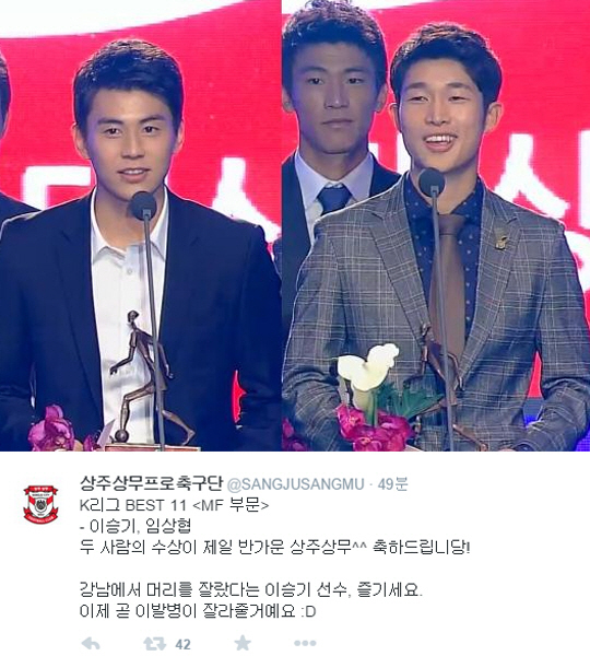 상주 상무는 1일 공식 트위터를 통해 "두 사람의 수상이 제일 반갑다"라며 "강남에서 머리를 자른 이승기 선수, 이제 곧 이발병이 잘라줄 것"이라는 유머도 곁들였다.