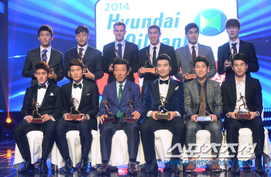 최강희 전북현대 감독과 MVP 이동국을 비롯한 '2014 K리그 대상' 수상자들이 포즈를 취하고 있다. '2014 K리그'를 결산하는 이번 시상식에는 MVP 후보에 오른 이동국(전북), 차두리(서울), 산토스(수원)을 비롯해 영플레이어상 후보 김승대(포항), 안용우(전남), 이재성(전북) 등 올해 K리그를 화려하게 수놓은 선수들이 총출동했다. 수원=최문영 기자 deer@sportschosun.com /2014.12.01/