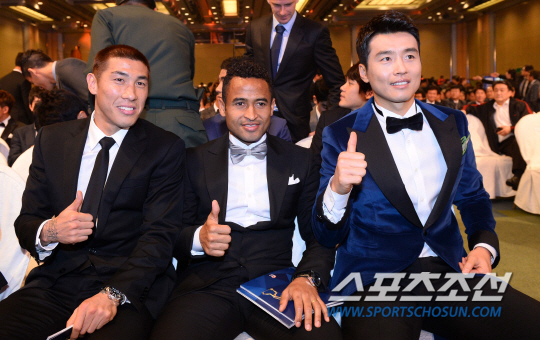 차두리-산토스-이동국이 1일 홍은동 그랜드 힐튼호텔에서 열린 2014 K리그 대상 시상식에 참석에 포즈를 취하고 있다. '2014 K리그'를 결산하는 이번 시상식에는 MVP 후보에 오른 이동국(전북), 차두리(서울), 산토스(수원)을 비롯해 영플레이어상 후보 김승대(포항), 안용우(전남), 이재성(전북) 등 올해 K리그를 화려하게 수놓은 선수들이 총출동했다. 최문영 기자 deer@sportschosun.com