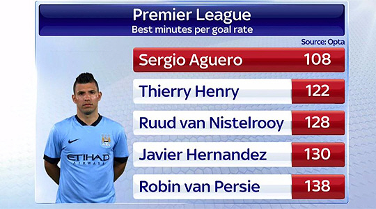 EPL 4년차에 접어든 아구에로의 득점 페이스는 티에리 앙리(122분), 뤼트 판 니스텔루이(128분), 하비에르 에르난데스(130분), 로빈 판 페르시(138분) 등 EPL 역대 최고 골잡이들을 앞지르고 있다.