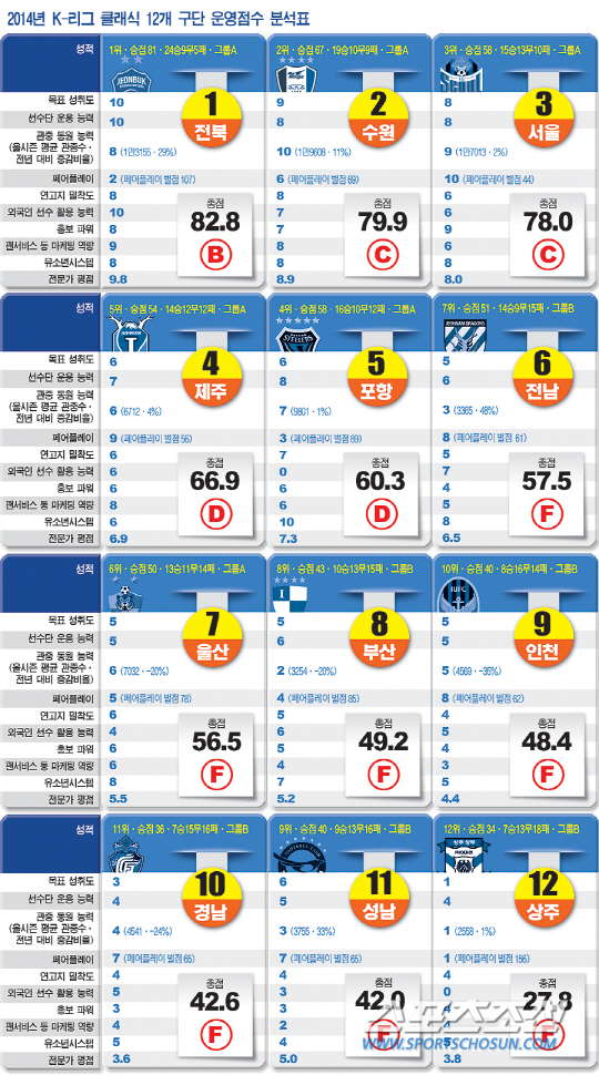 스포츠조선 축구전문기자 9명이 클래식 14개 구단의 2014년 올시즌 운영 성적표를 매겼다. 전문가 4명(한준희 KBS 해설위원, 이상윤 MBC 스포츠플러스 해설위원, 박문성 SBS 해설위원, 장지현 SBS스포츠 해설위원)의 평가도 반영했다. 개막 전 목표 순위와 현재의 위치를 평가한 목표성취도를 비롯해 선수단 운용 능력 관중 동원 능력 페어플레이 연고지 밀착도 외국인 선수 활용 능력 홍보 파워 팬서비스 등 마케팅 역량 유소년시스템 전문가 평점 등 경기력과 행정 능력 등을 종합 평가했다. 항목당 10점 만점으로 난상토의 끝에 최대공약수를 도출했다.