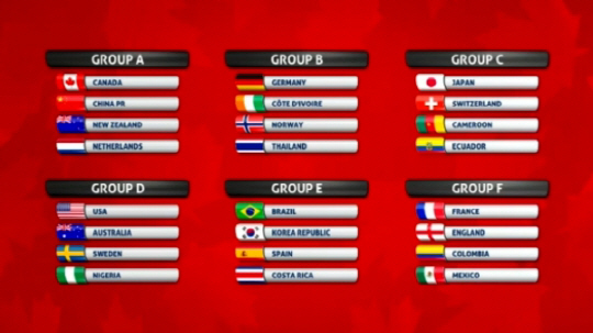 이날 진행된 조 추첨은 대륙 안배 원칙을 따랐다. A조에는 캐나다, 중국, 뉴질랜드, 네덜란드, B조에는 독일, 코트디부아르, 노르웨이,태국, C조에는 일본, 스위스, 카메룬, 에콰도르, D조에는 미국, 호주, 스웨덴, 나이지리아, E조에는 브라질, 한국, 스페인, 코스타리카, F조에는 프랑스, 잉글랜드, 콜롬비아, 멕시코가 포진했다. 캐나다와 중국이 에드먼턴에서 개막전을 치르게 됐다.