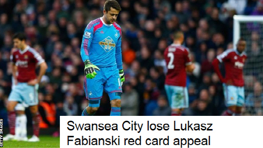 스완지시티의 주장은 달랐다. 게리 몽크 스완지시티 감독은 경기 후 "사코의 핸드볼 파울이 먼저 있었다"고 주장했다. 그러나 스완지시티의 항소가 실패로 끝나 파비안스키의 결장이 확정됐다. 영국축구협회(FA) 대변인은 "파비안스키는 명백한 골찬스를 파울로 저지시켰다. 퇴장 징계에 따라 1경기에 출전할 수 없다"고 설명했다.